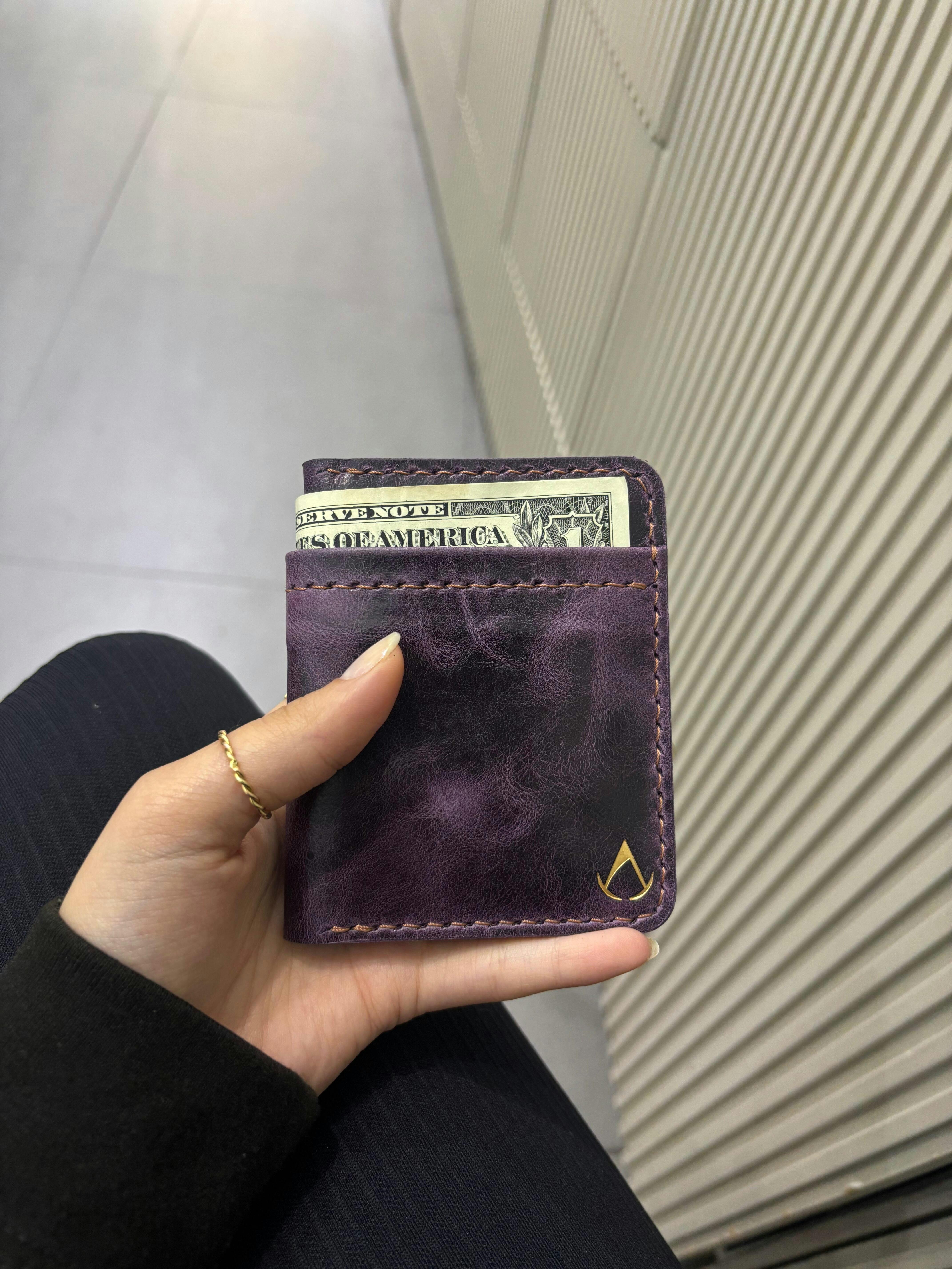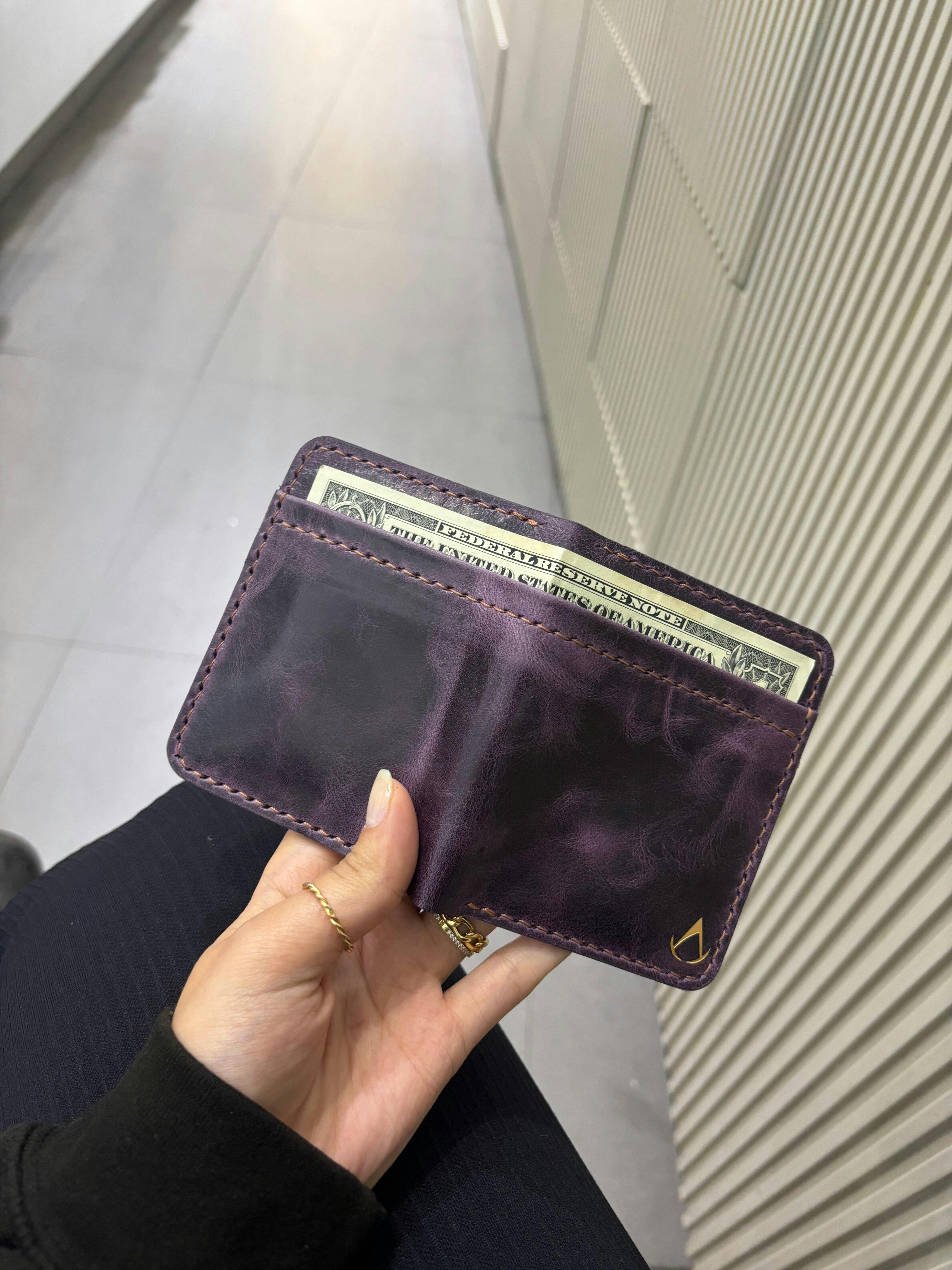 Introducing the Dual Haze Minimal Wallet – a true standout for those who appreciate uniqueness and vintage style. Handcrafted from premium leather, this wallet boasts a rare combination of deep purple and forest green, creating a bold yet sophisticated two-tone aesthetic.